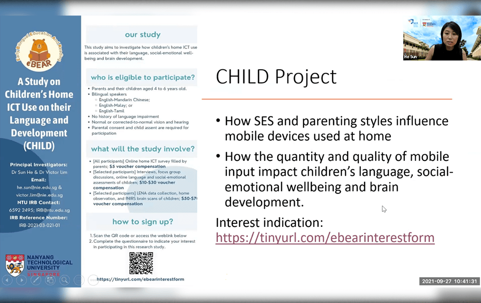 Dr Sun He, a Research Scientist from the Centre for Research in Child Development (CRCD) and NIE’s Office of Education Research (OER), was invited to speak at a professional learning webinar organised by the Multimodality Special Interest Group (MM SIG) on 27 September 2021. “Enhanced eBooks and Early Mother Tongue Language Learning: Implications from an Eye-tracking Study” was the title of Dr Sun’s sharing, which is based on data from her recent study.